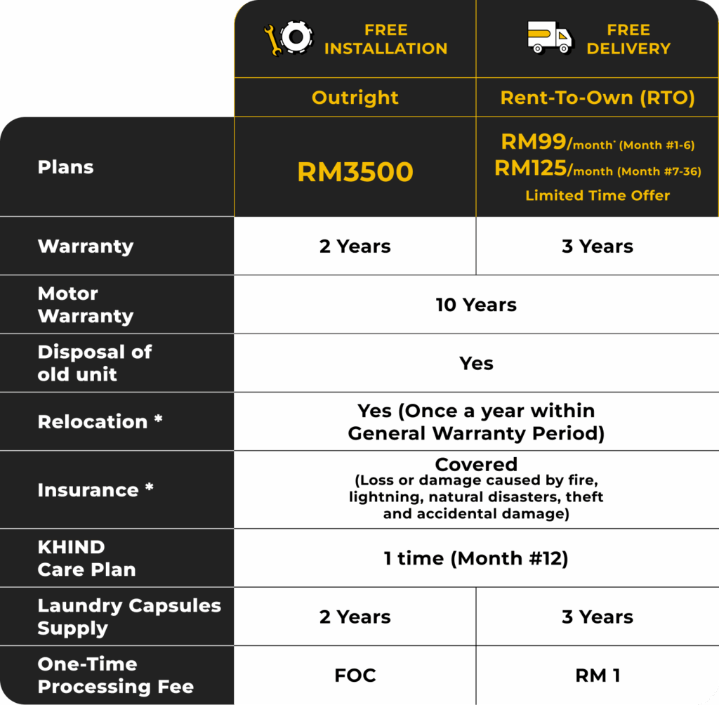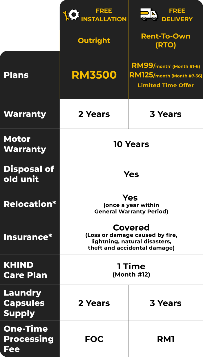 Dengan pelan Rent-to-Own (36 bulan), anda akan menerima servis KHIND Care Plan (KCP) setiap 12 bulan sekali. Pasukan servis KHIND akan hubungi anda untuk tetapkan janji temu.