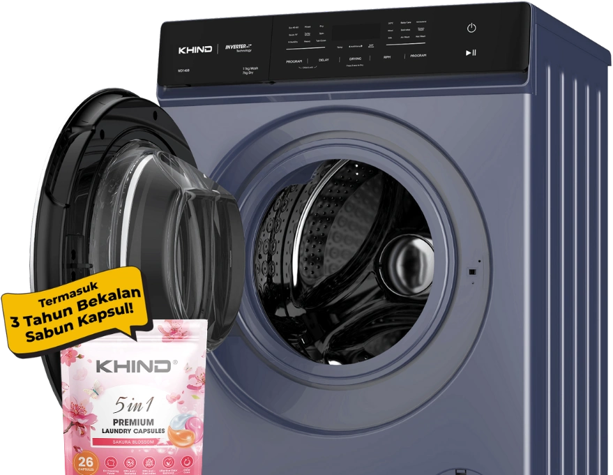 KHIND 2-in-1 Washer Dryer tampil dengan 18 mod cucian, fungsi Steam Wash dan 1 Hour Wash & Dry. Lebih besar, lebih canggih, semua siap dalam satu sentuhan.